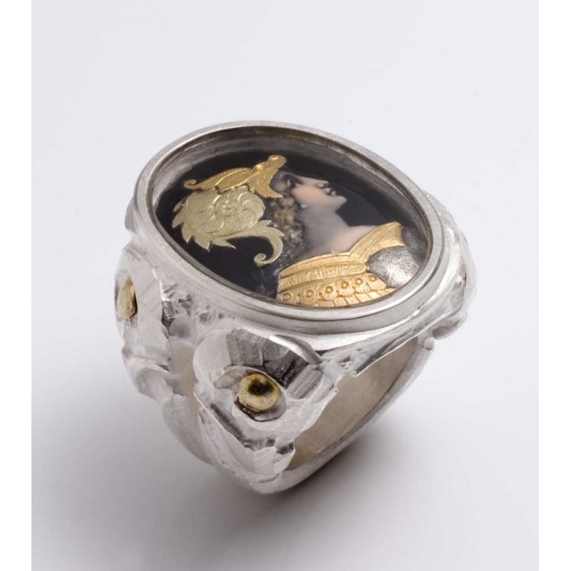 Aufträge, wie man sie liebt: unser Kunde brachte eine bezaubernde, antike Emaille Platte, zu der er einen Ring anfertigen lassen wollte. Hier das Ergebnis in Sterlingsilber und 900er Gold. Die Emaillearbeit liegt sicher hinter Acryl geschützt.